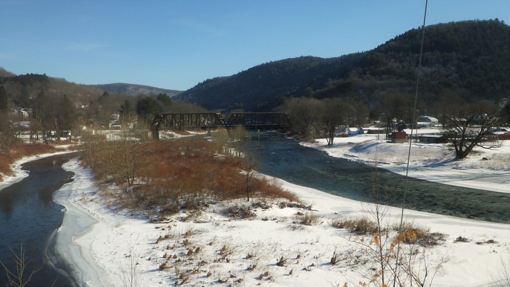 I took my river walk yesterday afternoon, when the sun broke through and lit the east bank, it’s light already diffused, past it’s apogee west of Point Mountain. The river revealed a mosaic of windblown snow piles, ice jams, and pockets of open water, one flowing upstream, the others ever southward to the Delaware. Some pockets had fast currents derived from the constrictions of the ice, water fleeing wherever it could escape; as all that reach of river below Crooked Eddy is calm water at the lower flows we have now. I hope the resident trout are hunkered down in the deepest parts of the Eddy, safe from the invading ice.