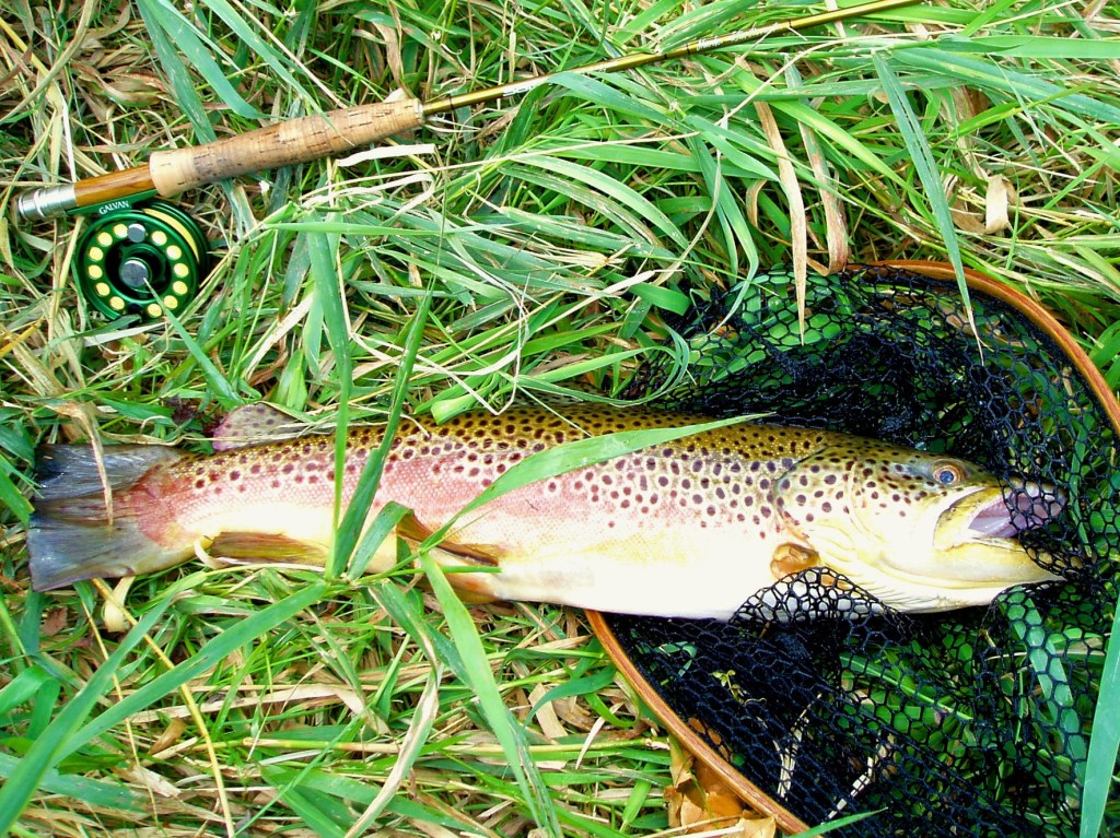 I had tied a new hopper pattern, the final “keeper” version of a design I called the kick leg hopper, and I was out late that August afternoon to test it out. It was hot and breezy and I managed a couple of smaller rainbows as I worked my way up the meadow. When I reached the dreaded willow pool I stayed back and watched for a while. Things got serious when I saw a ring under there a foot away from the exposed roots. I checked the knot on my hopper and slipped into the water as quietly as possible, moving into casting position without pushing any waves up into the shade. This spot was one cast and done, and my fly alighted perfectly, gently and way up ahead of the lie. It seemed long moments for that fly to float the foot and a half it had to cover drag free, but a heavy bulge caused a quick reaction and a wicked bend in my 7 foot fly rod. That big boy tore up some weed beds, but I kept him out of the pile of sunken branches and finally brought him to the net; a heavy and beautifully colored brown better than twenty inches long.