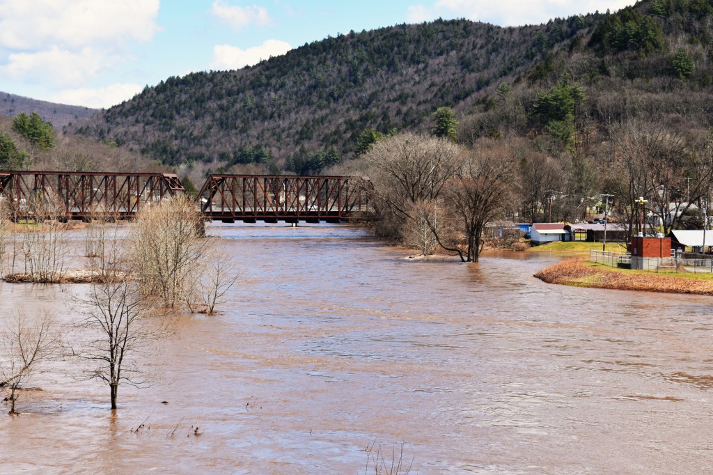 Unbuffered by a reservoir, the Beaver Kill rises with a dramatic spike in her flow. An hour or so before Noon on Thursday she flowed near 1,000 cfs, just after midnight reaching her crest in the range of 20,000 cfs! At 6:30 EST this morning the flow had receded to 3,280 cfs – dramatic indeed. The upper East Branch below Pepacton Reservoir remains above flood stage this morning, the reservoir dampening both the river’s rise and its fall. Where these rivers meet in East Branch, New York, the smaller upper arm of the East Branch Delaware is contributing perhaps twice as much water as the larger Beaver Kill, with her high flows sustained over a much longer period.