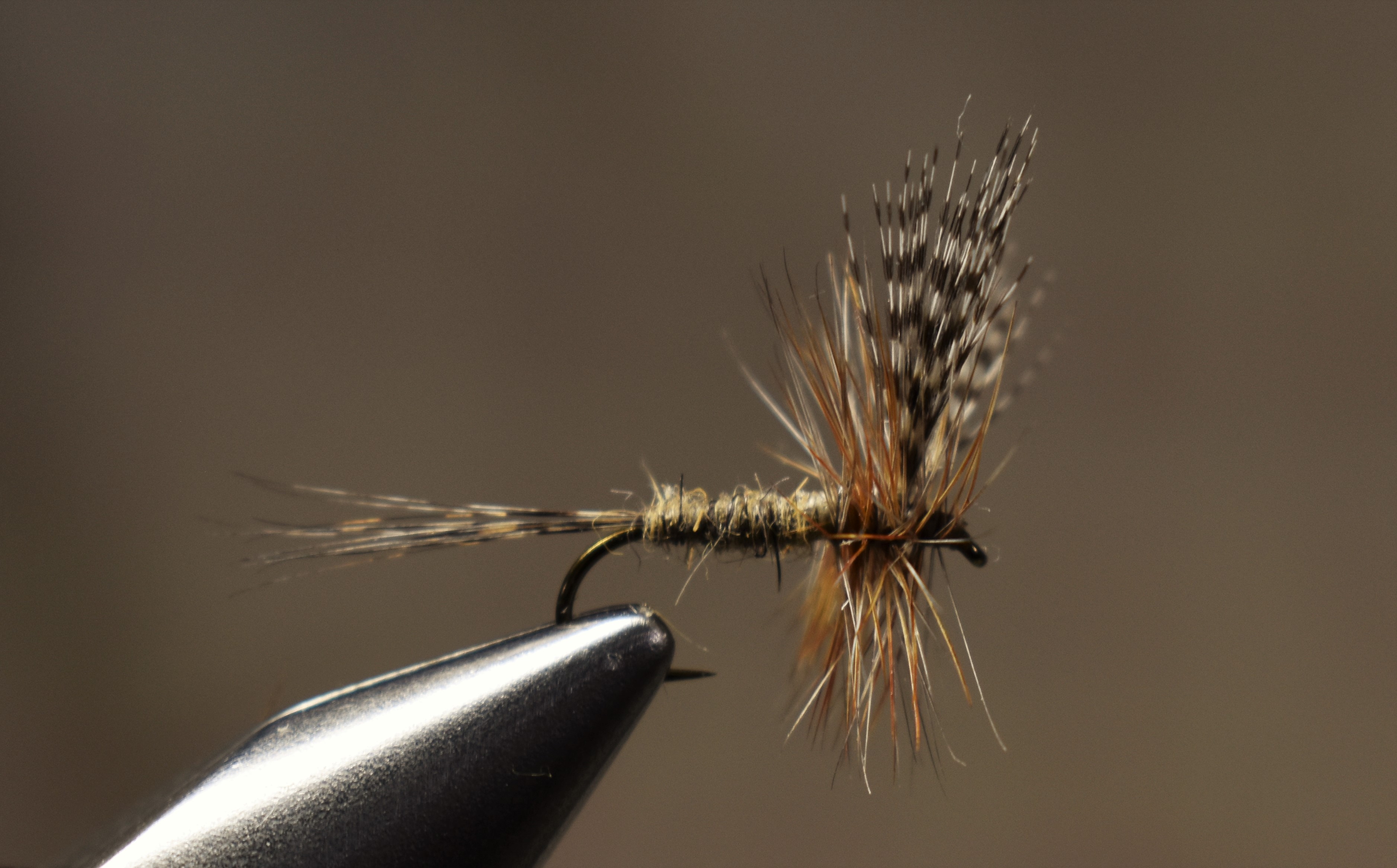 Tonight, we will tie those Conovers I practiced on this morning. It is a venerable old Catskill pattern that has been found in the Dette shop since 1934, when they started tying the pattern for Scotty Conover of the Brooklyn Flyfishers, the fly’s originator. I had blended some dubbing I ran across the other day. I looked the pattern up in the late Eric Leiser’s charming book “The Dettes: A Catskill Legend” and felt my old blend was a bit darker than ideal, so I added some more gray muskrat underfur to bring it to the “heathery gray claret” described by Winne Dette in the text.