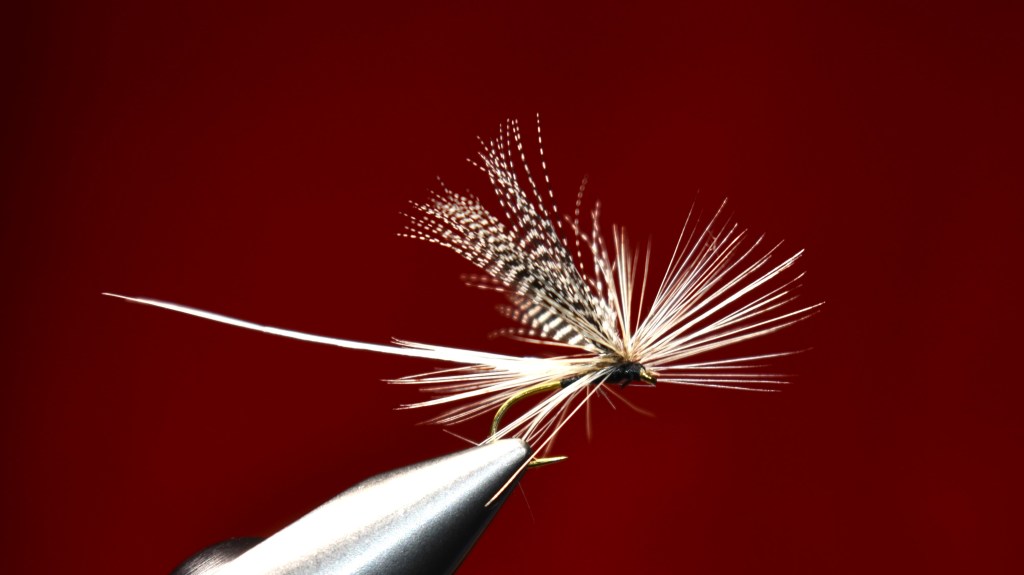 I thought the name chosen somewhat belied the strength of the design, as this seems the perfect style of fly to present gently to some leviathan lurking in shallow still water, a fly that might be wafted upon the quiet surface and then drift temptingly straight into dramatic memory! The extended body with tails is cut from a hackle feather, wings affixed Catskill style, and a stiff barbed hackle wrapped parachute style with two turns. We all tied a few as the discussion roamed a bit, typical for our informal winter Zoom gatherings.