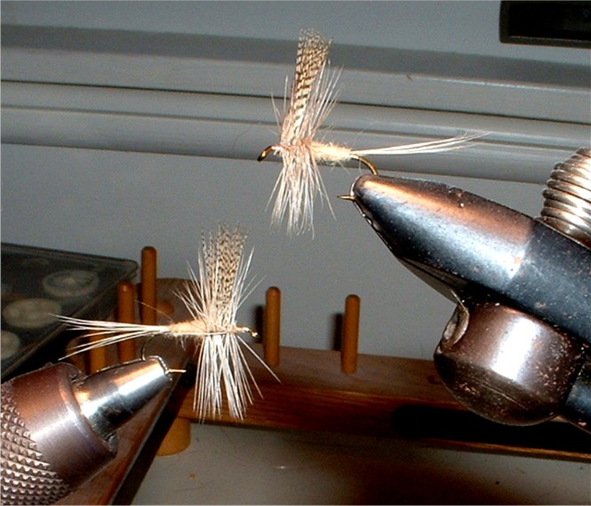 My standard Hendrickson is based on flies I purchased from Mary Dette three decades ago. I blended various shades of natural Red Fox fur with tan dyed beaver and a touch of Antron dubbing to match the color to the Dette flies, but there are variations even in the same pattern. Mary’s fly shows her beautiful upswept hackle barbs for the tail and a bit of cant to the wings. I purposely splay my tail fibers on nearly all of my dry flies, as I feel they float better and have a more natural light pattern. My wings are perpendicular to the hook shank as I was taught by Larry Duckwall, a well-known Catskill fly tyer and student of Elsie Darbee.