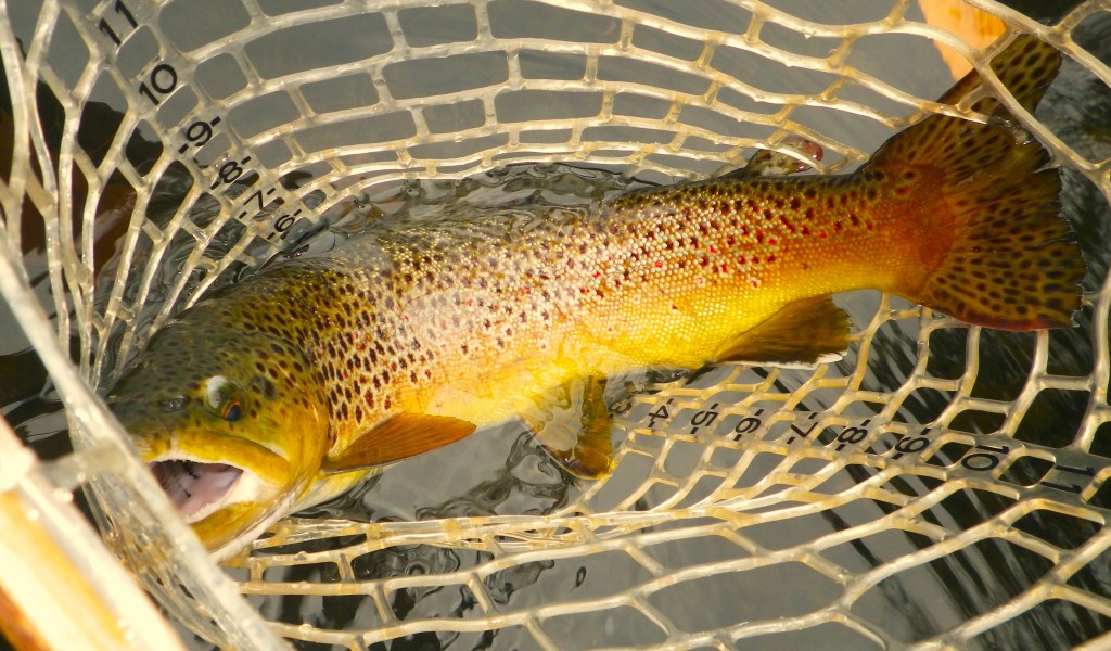 A fine brown trout to close the season, cradled in the net while I snapped a photo. Nineteen inches and…something. A very fine trout indeed!