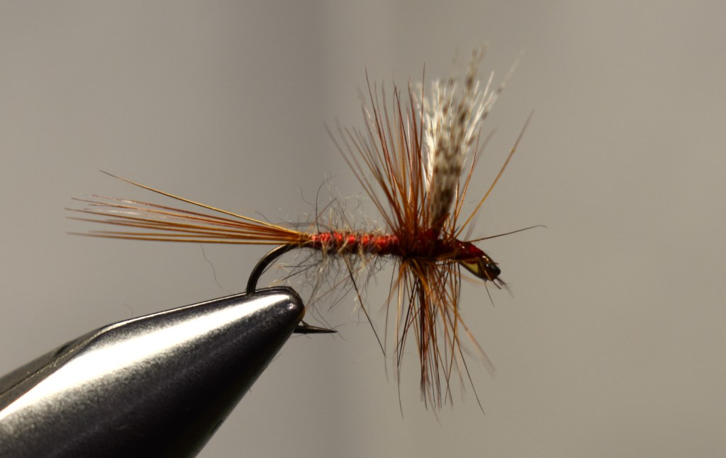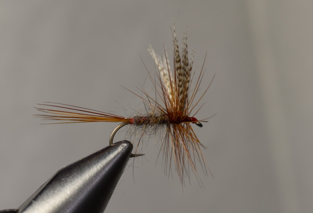 Considering the “Bradley Special“: A body of Red Squirrel spun on red silk, mallard for the wings, slightly flared, and hackle and tails from a Rhode Island Red rooster.