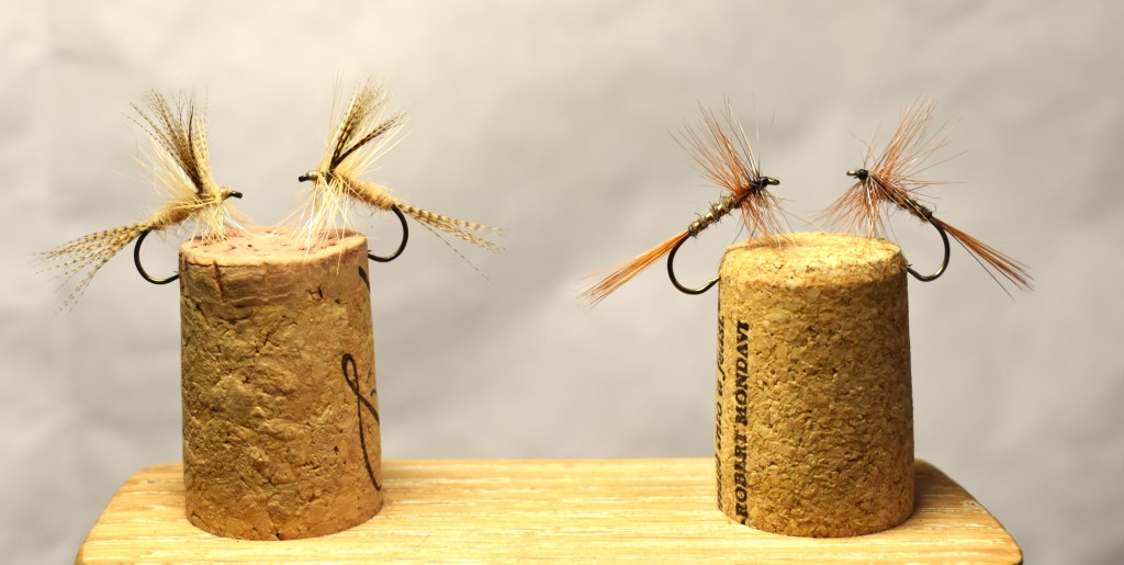 Mike Valla’s wonderful “The Founding Flies”, published a decade ago, includes a photo of Theodore Gordon’s tie. His Golden Brown Spinner reveals the canted single wing of wood duck flank that inspired my 100-Year Dun dry flies, prompting me to tie a few in that style this morning.