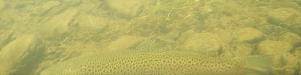 The challenge of blind underwater photography: submerge cameraand find yourself unable to see the view screen; point & guess, withdraw camera from icy cold water into warm, humid summer air and view screen fogs, thus the photo capture cannot be observed. Resign self to hoping image is captured correctly. Find in editing that what was captured was less than that which was desired. Punt and call it artistic!A 19″ Delaware browntrout ponders the wisdom of selecting that tiny rusty spinner from those available for a morning snack.