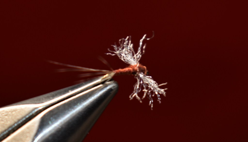 Tiny size 20 Rusty Spinners seem to have been the preferred early morning fare in these early weeks of summer. No more than a tying thread body, or a few wrapped strands of rust colored Trigger Point Fibers are required. I don’t go in for split tails on smaller spinners, preferring splayed hackle fibers for a little more support in the film. Clear Antron yarn, or a few Spinner Wing Trigger Point Fibers work nicely for the wings. Fishing flies should be realistic, effective, and quick and easy to tie! The fine brownie in the opening Fly Over photoselected one of these from Nature’s offerings.